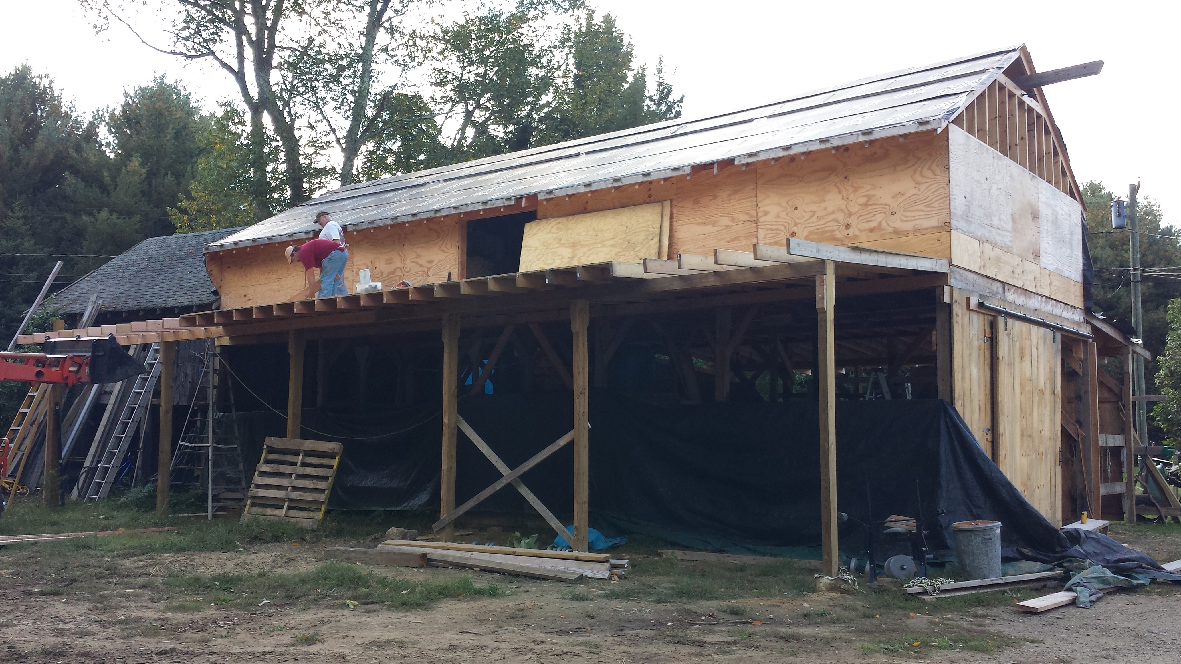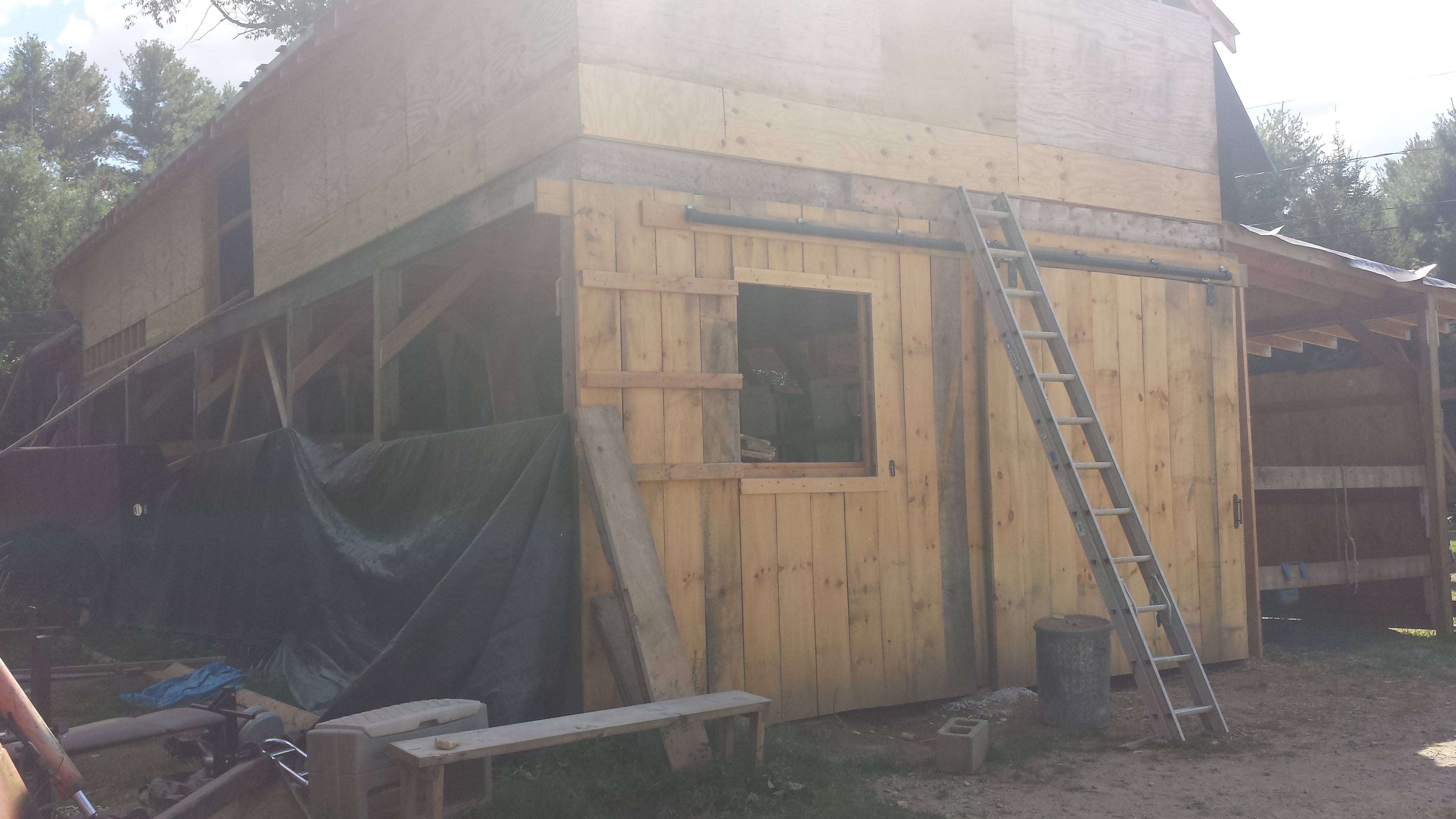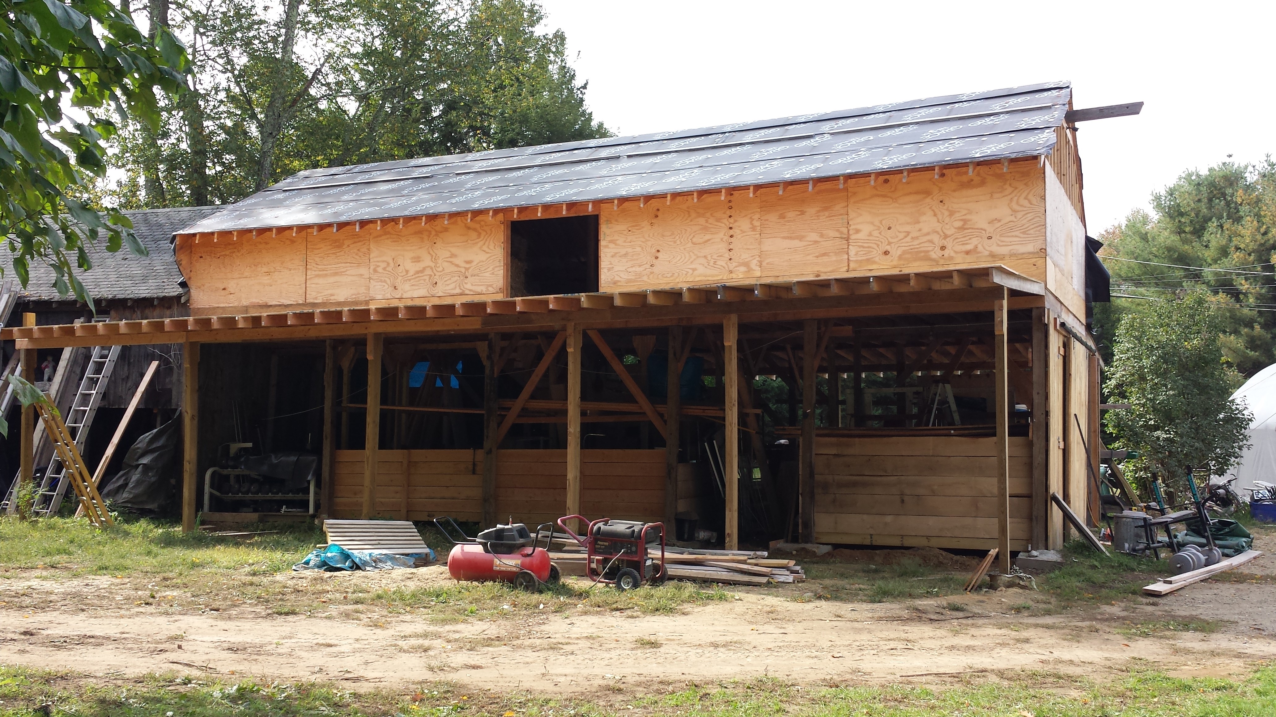 We worked on this project for a year, as we found extra time and as money became available. It is looking like a New England barn and happily for me, usable. Last winter was harsh so we buttoned up the walls with tarps. That worked nicely to keep the wind from blasting through. The horses seemed comfortable. We fed the large bales of hay under a wing and they ate it as they became used to the flapping of the tarps. It is amazing how food can calm horses as well as people.